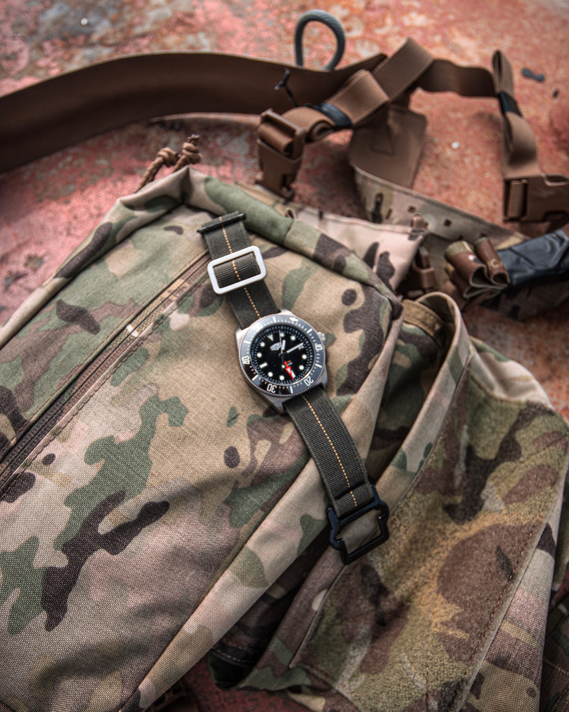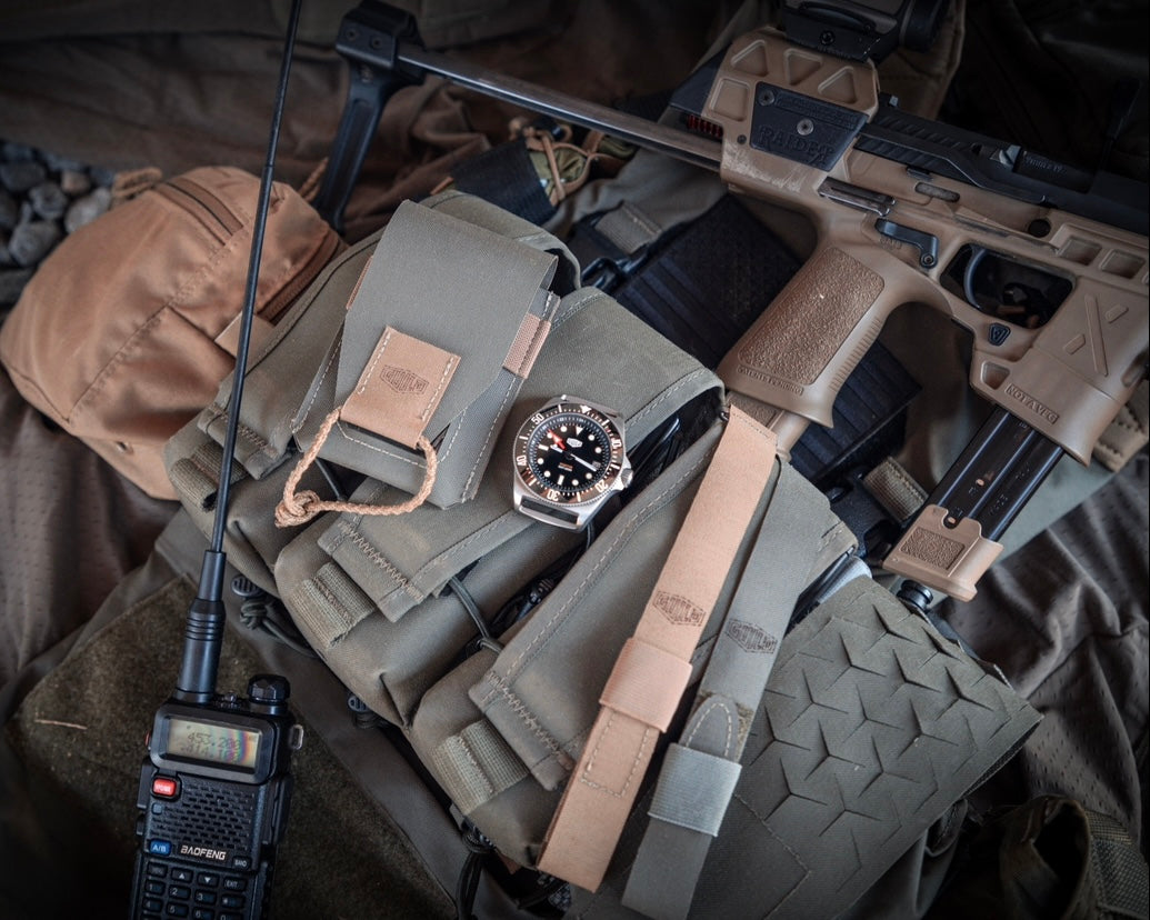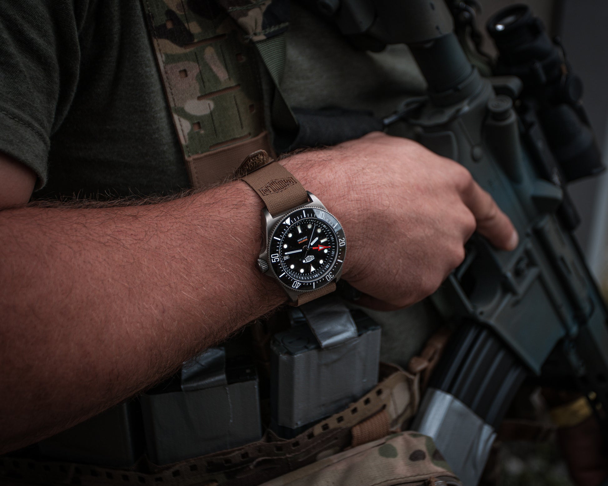 Included with each timepiece is choice of a Teardown Systems Ultralight Strap Velcro Ranger Green or a Velcro Coyote strap (both featuring brushed stainless hardware), and a Guild Timepieces X Teardown Systems Watch Caddy Ranger Green and Coyote exclusive colorway case