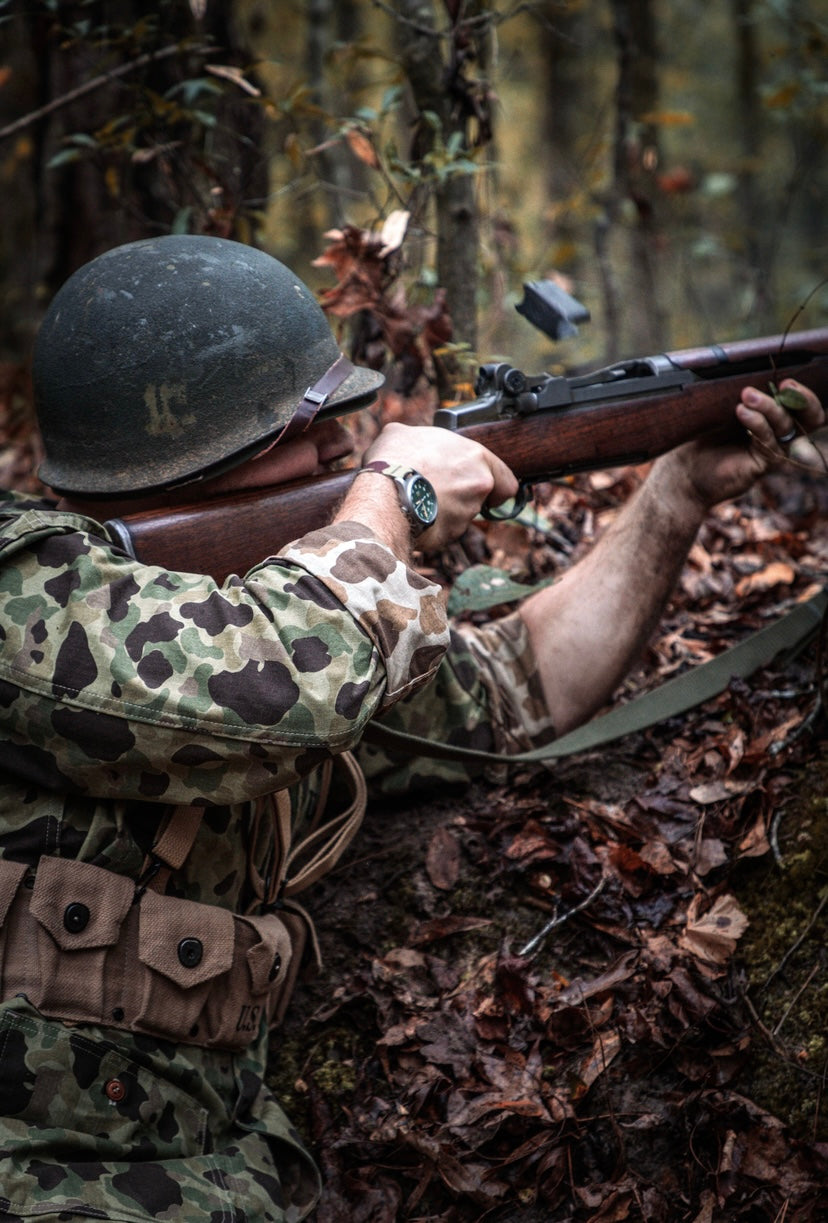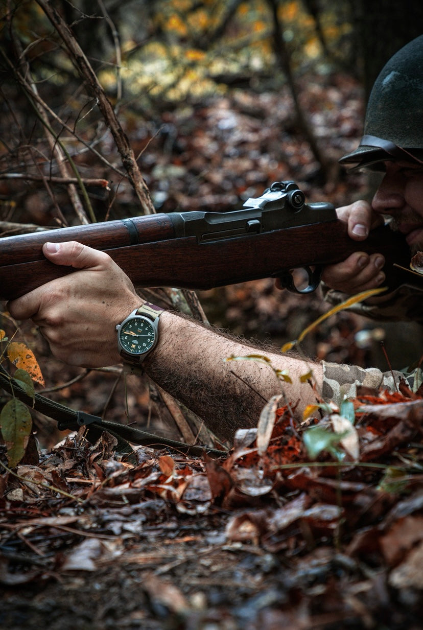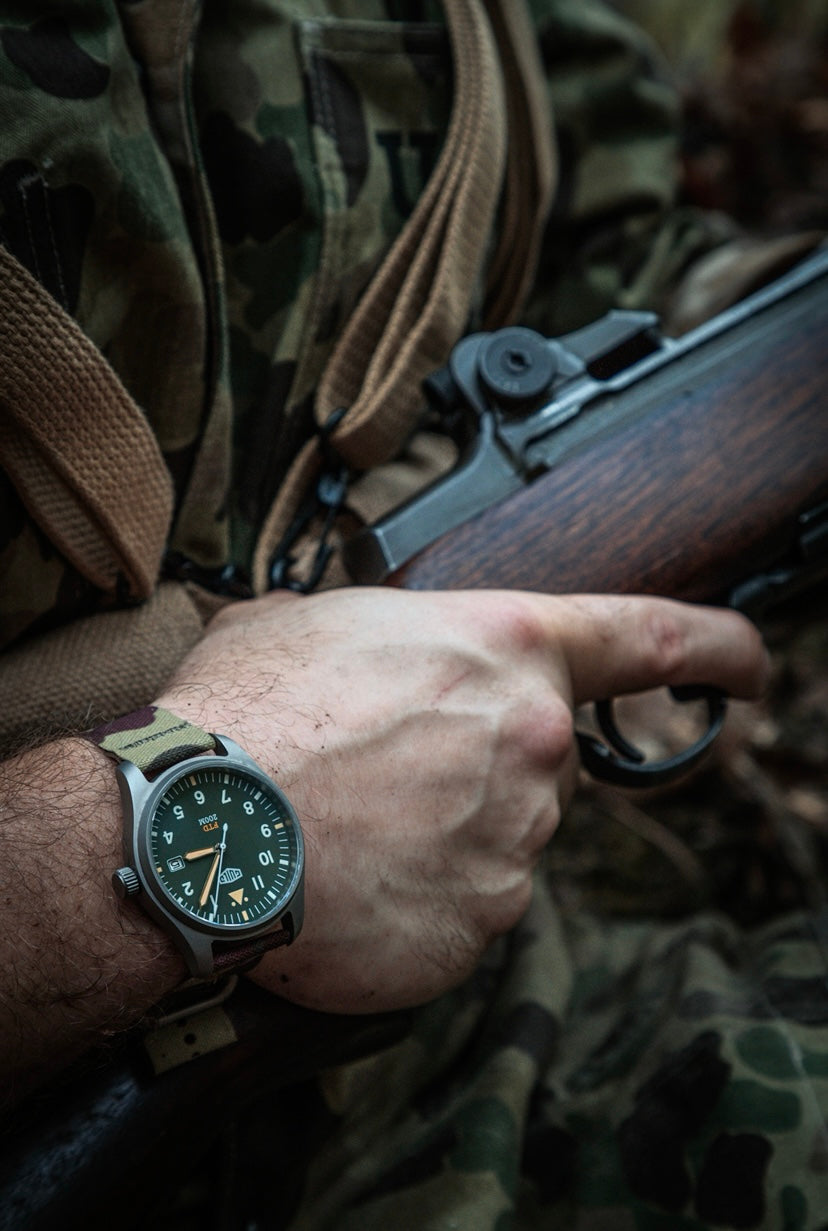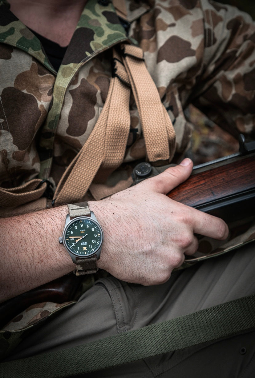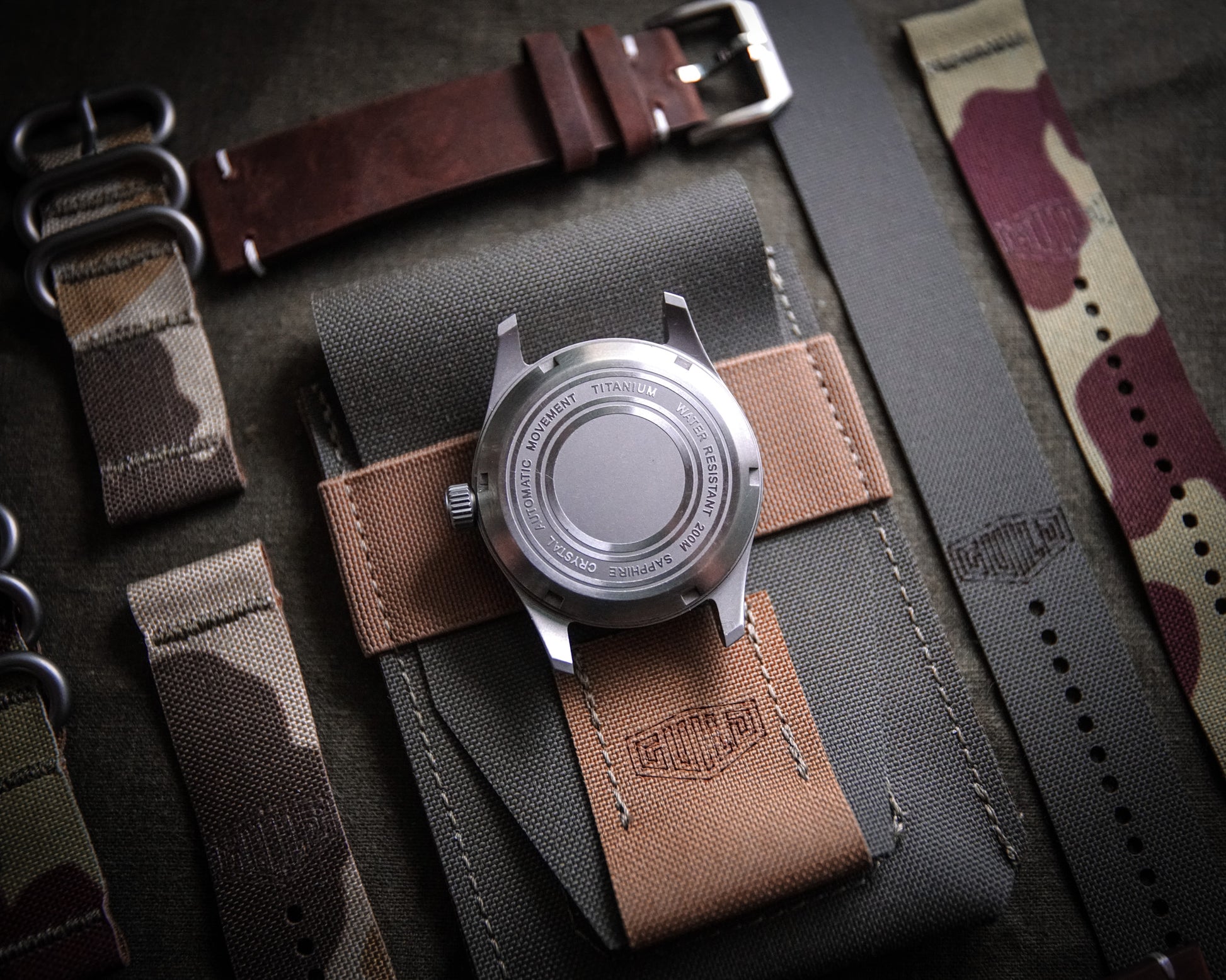 Included with each timepiece is a two piece brown leather strap, choice of a Teardown Systems Ultralight Strap in Two Piece Desert Frogskin, Two Piece Jungle Frogskin, or One Piece Ranger Green (all featuring brushed stainless hardware), and a Guild Timepieces X Teardown Systems Watch Caddy Ranger Green and Coyote exclusive colorway case