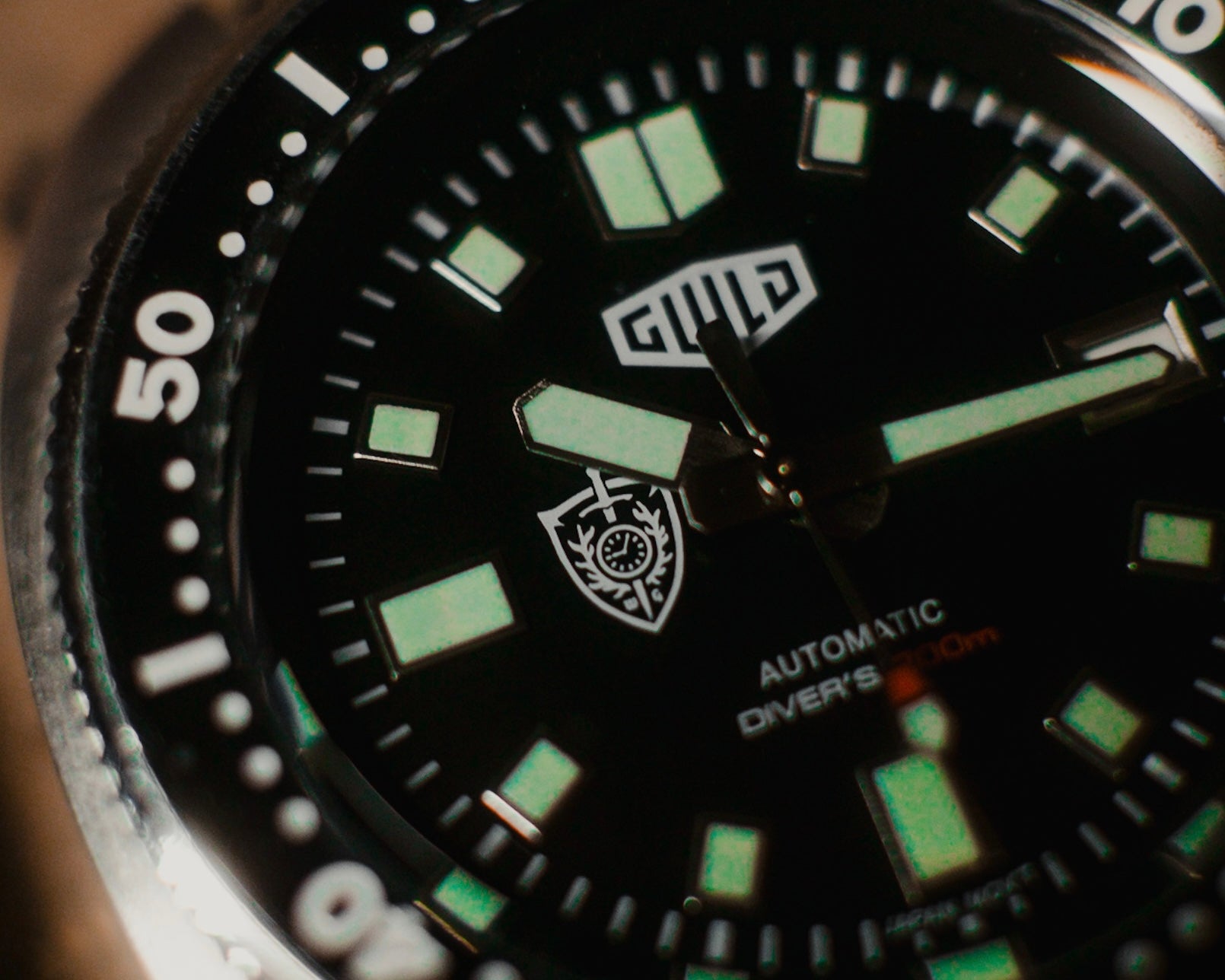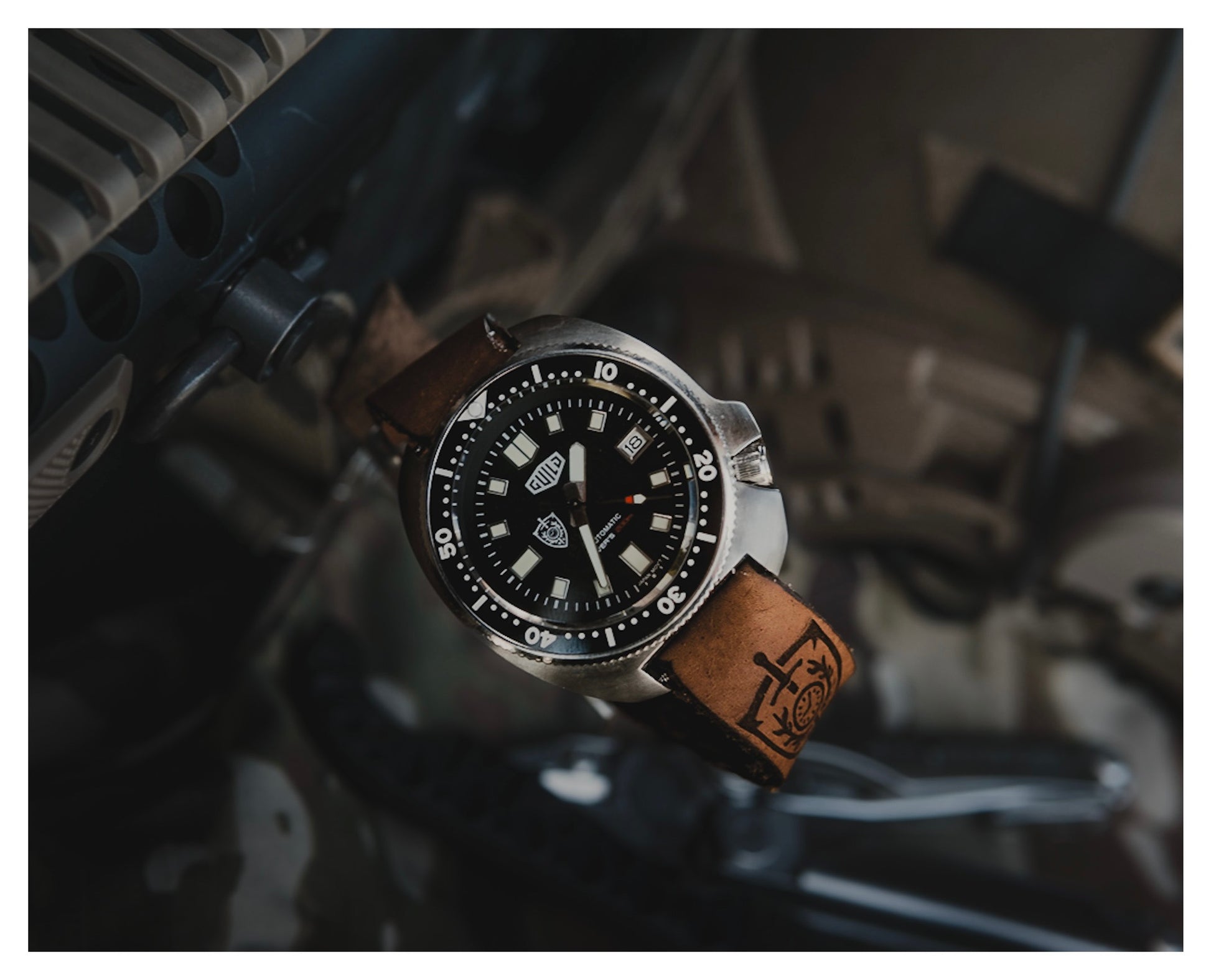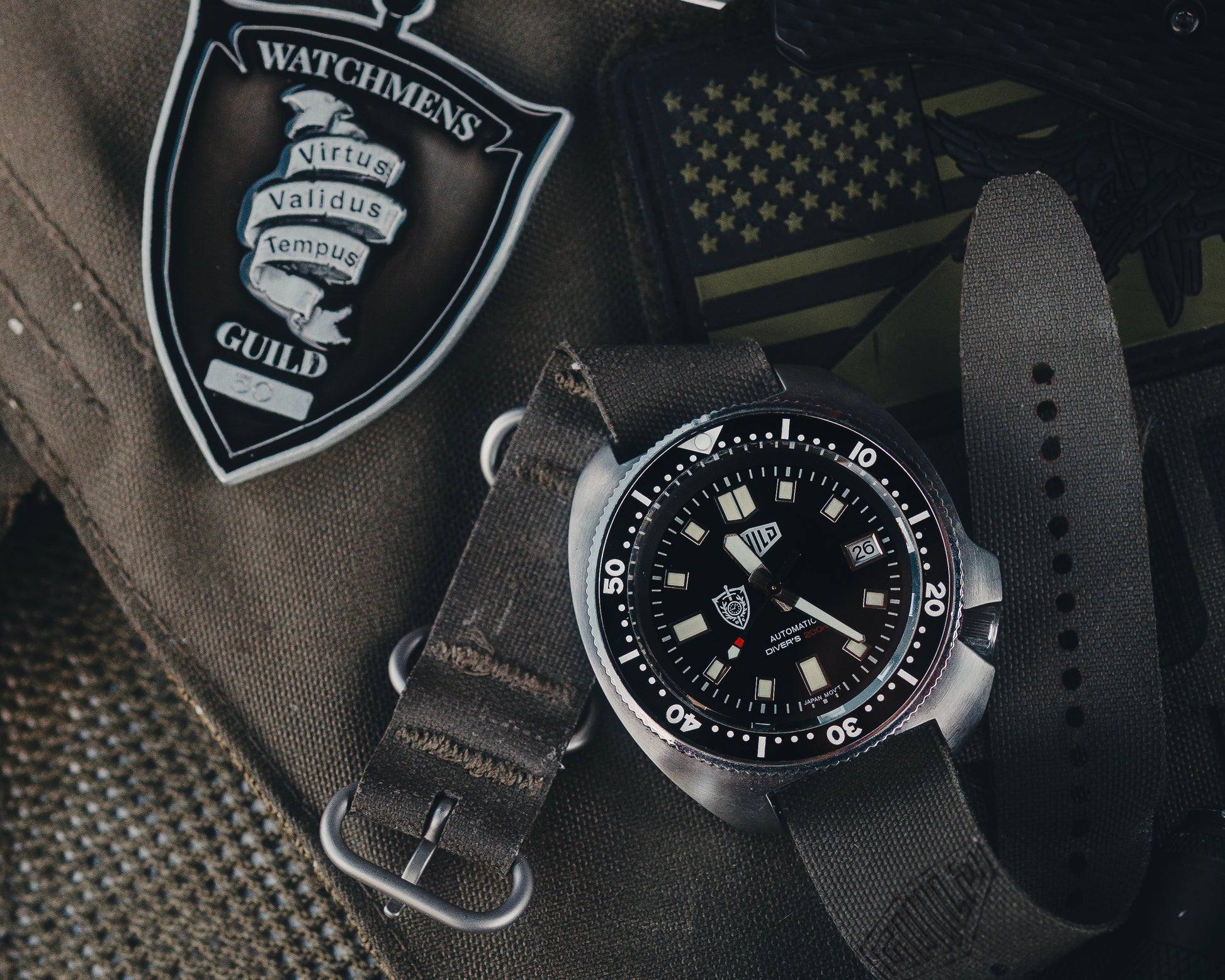 The dial displays the Watchmens Guild logo at 9 o-clock. Every caseback is engraved with the Watchmens Guild logo and an individual manufactured order serialization